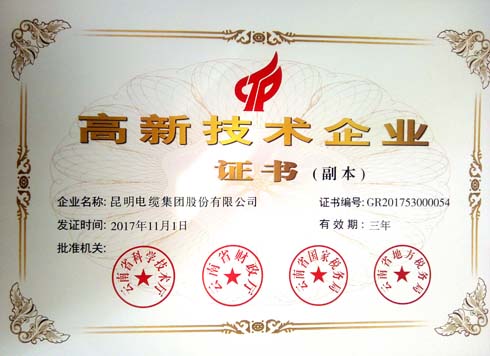 2017年12月,昆明電纜集團股份有限公司再次通過(guò)了高新技術(shù)企業(yè)的認定,被云南省科學(xué)技術(shù)廳、云南省財政廳、云南省國家稅務(wù)局、云南省地方稅務(wù)局認定為“高新技術(shù)企業(yè)”。[詳細]
